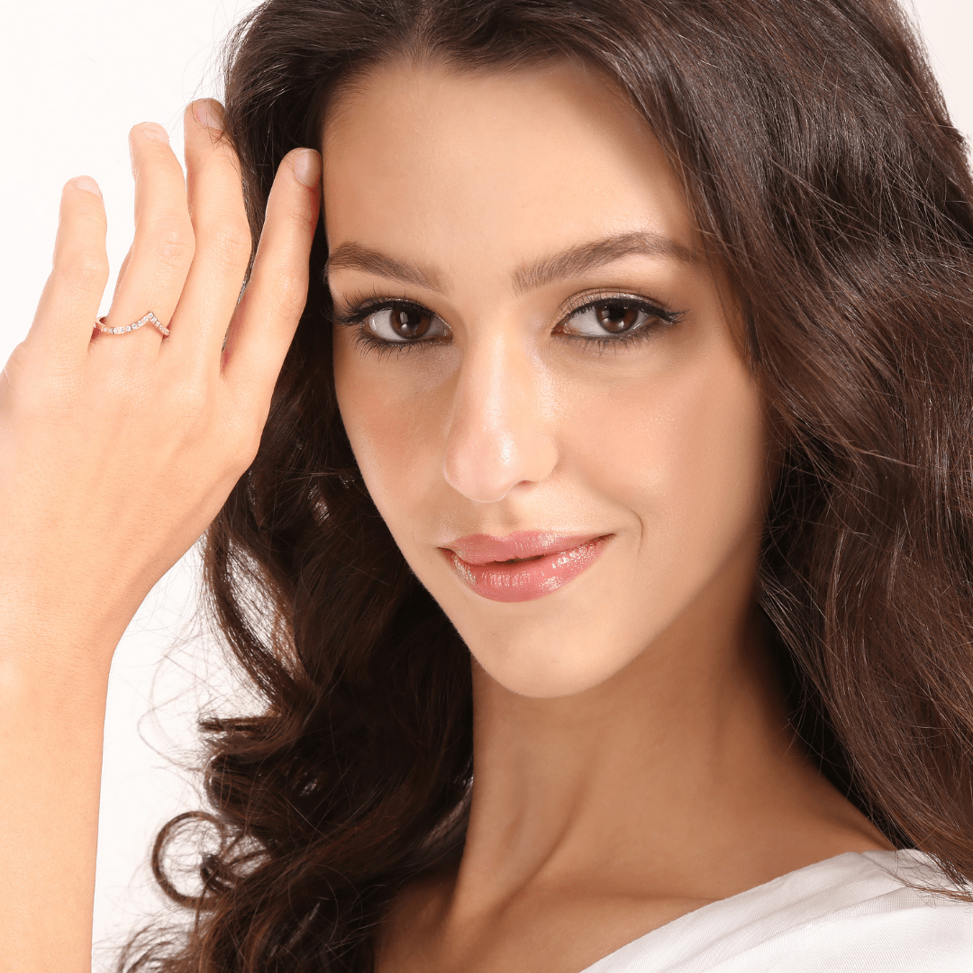 Prstýnek v designu zvaném chevron je vyrobený z pozlacené chirurgické oceli a zdobí jej třpytivé krystaly. Jedná se o moderní elegantní šperk, který je vhodný také jako snubní prsten pro ni. Skvěle se kombinuje s tradičními zásnubními prsteny a vynikne i samostatně.