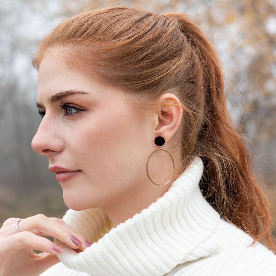 Klasické náušnice kruhy vyrobené z chirurgické oceli a pokryté 18k zlatem. Tyto kruhové náušnice jsou krásným a pohodlným doplňkem pro každodenní nošení. Skvěle vypadají ke všem outfitům a sluší ženám všech generací.