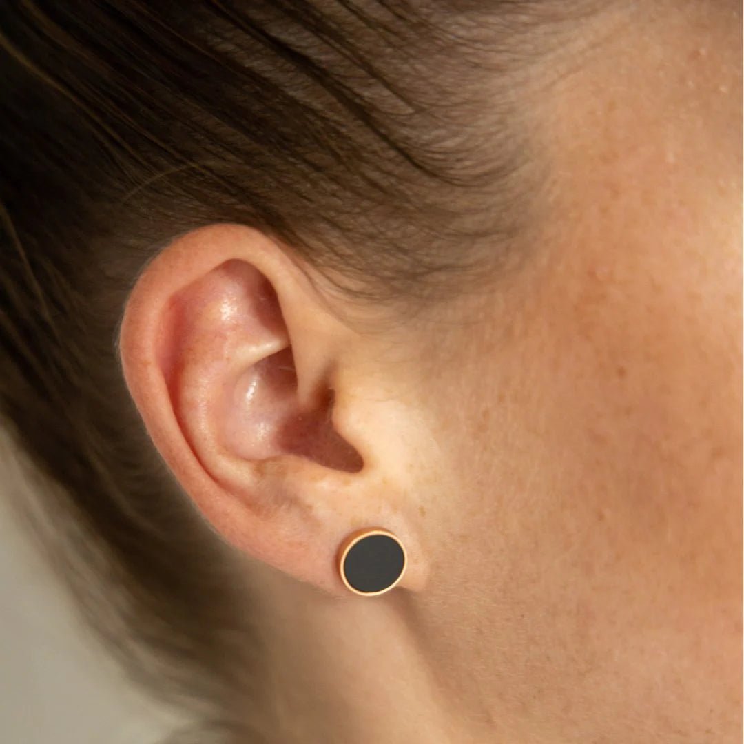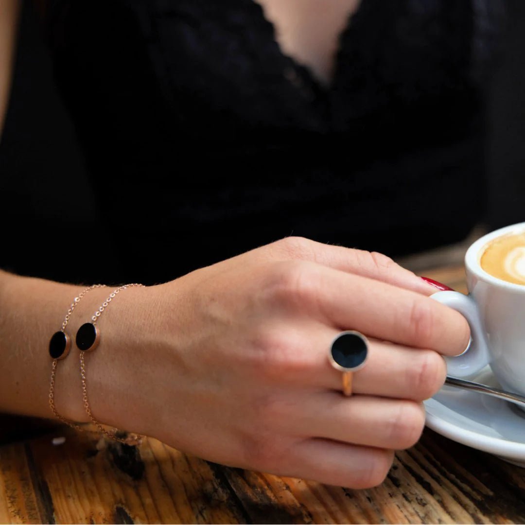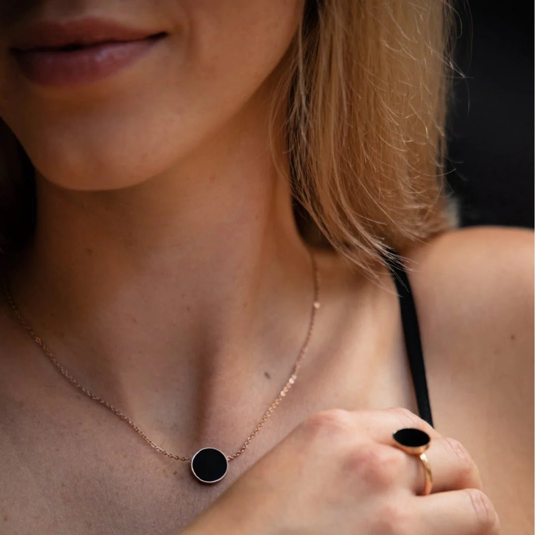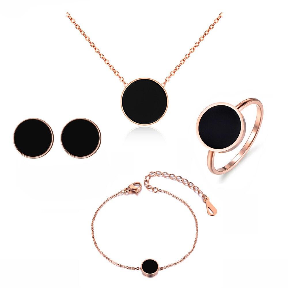 Set šperků v barvě růžového zlata, jehož společným motivem je černý kruh. Prohlédněte si kruhový náhrdelník a kruhové náušnice, kruhový náramek a kruhový prsten, jež se skvěle hodí na každodenní nošení. Sada je ideálním dárkem pro mladé slečny i všechny ženy, které rády nosí jednoduché a elegantní šperky.
